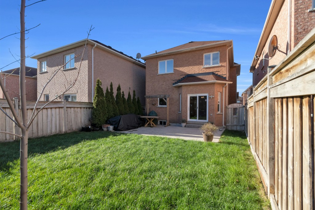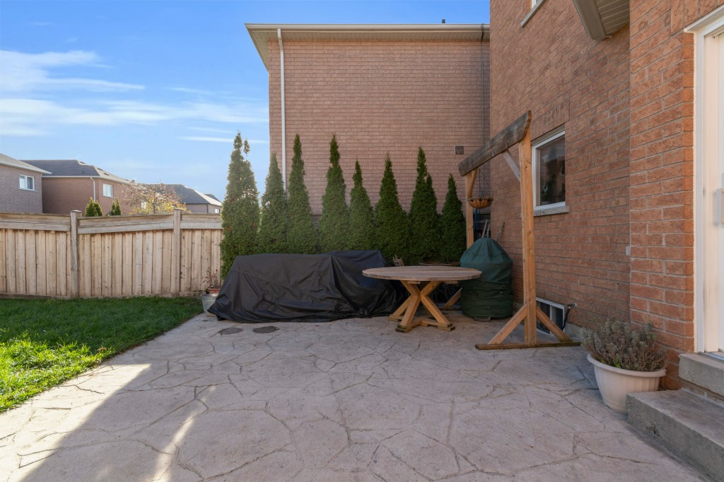Backyard Features An Oversized Reinforced Patterned Concrete Patio (Approx. 12–15 Yards Of Cement With Rebar And Deep Gravel Base), Mature Cedars, New Spotlight, Rear Weeping System With French Drain, And Secured Fencing (Cleaned/Brightened 2025).